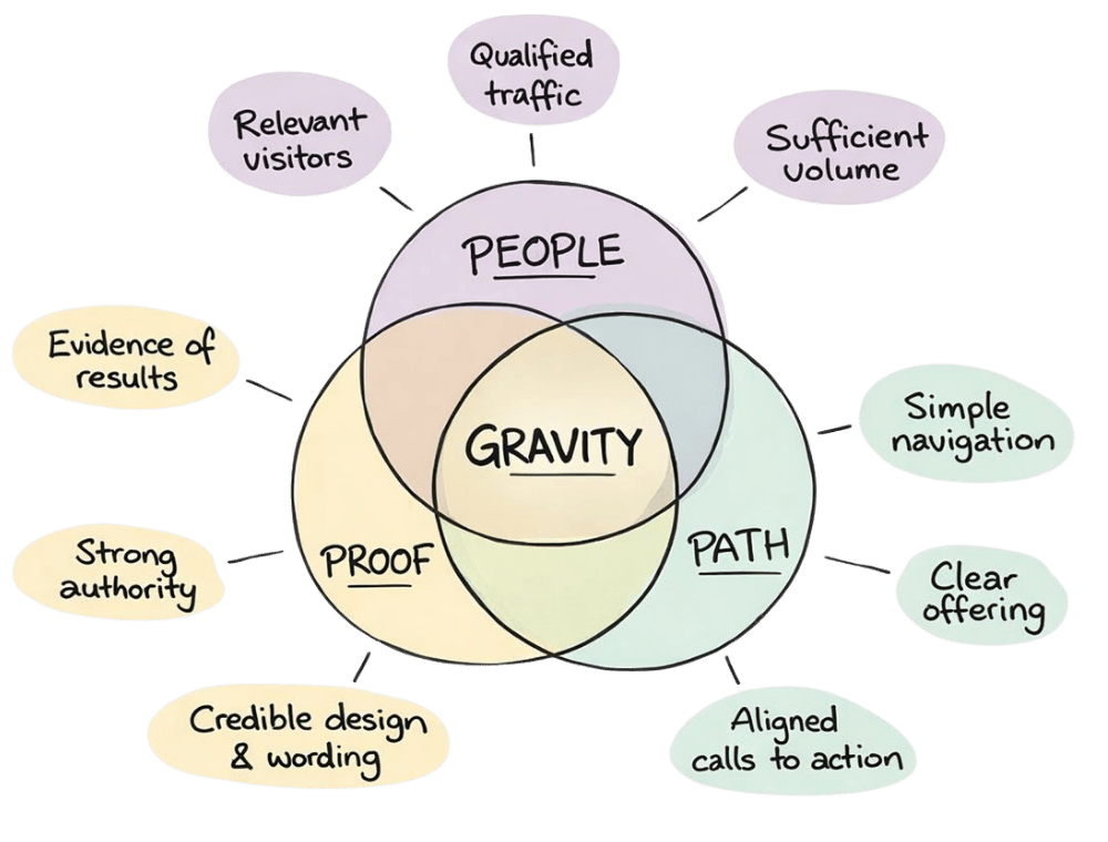 I developed the Web Gravity Framework after years of reviewing and redesigning service business websites. It breaks down a website's performance into three interdependent elements, and identifies which one is the weak link.